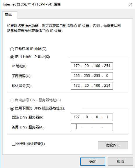 | 内网域控服务器(Windows Server 2016) | 172.20.100.254/24 DNS:172.20.100.254 | — | 172.20.100.254 |