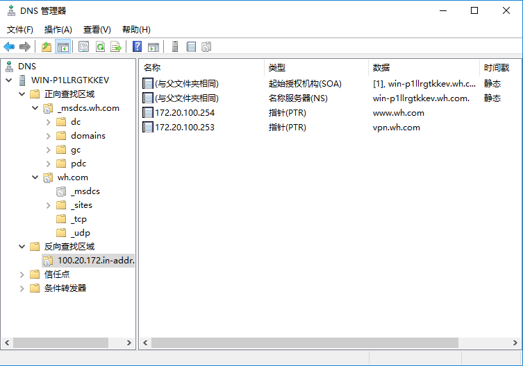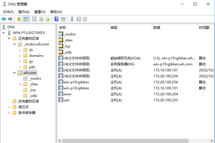 (1)打开dns管理工具,新建wh.com的区域,然后在wh.com区域右击新建主机,然后增加正向解析,将www.wh.com解析到172.20.100.254,将vpn.wh.com解析到172.20.100.253。