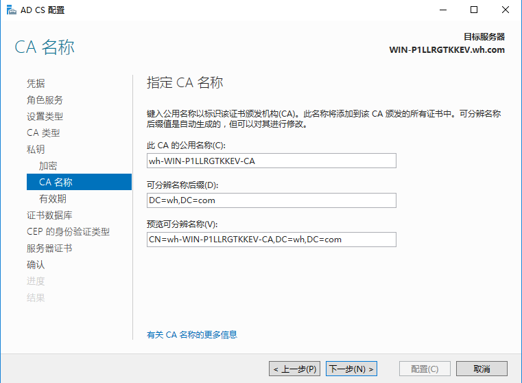 (7)设置CA的名称以及后缀等,此处使用默认选项,然后点击下一步。