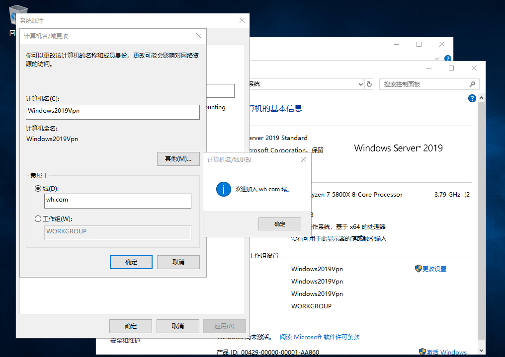 打开计算机的域控更改页面,点击域选项,设置域控为wh.com,然后点击确定服务器将会自动重启。