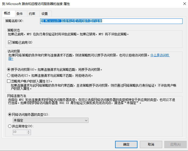 (8)点击网络策略,进入策略名称,首先启用测控,并且勾选授予访问权限。