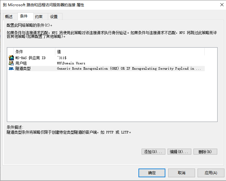 (9)进入条件菜单,设置隧道类型为勾选全部协议,设置用户组为domain users用户组(wh用户所在的用户组)完成之后点击确定。