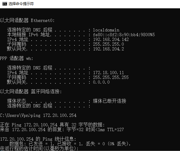 (2)配置完成之后连接vpn,发现ppp隧道得到分配的地址池172.18.100.0/24的ip地址。