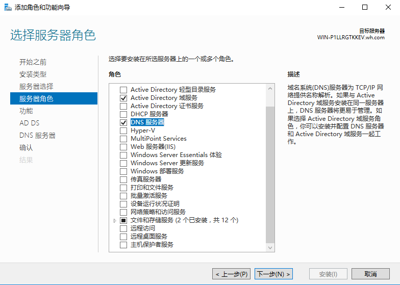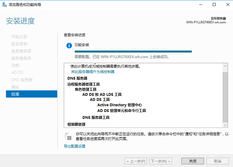 (1)在服务器管理中首先增加域控服务和dns服务,选择完成点击下一步。