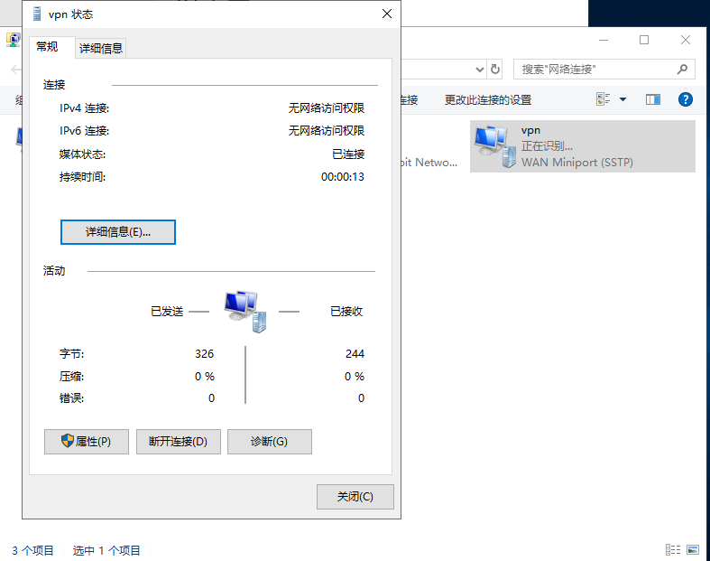 (7)在Windows客户机上配置一个sstp的vpn进行连接,连接完成之后发现可以进行内网数据的访问,说明sstp配置成功。
