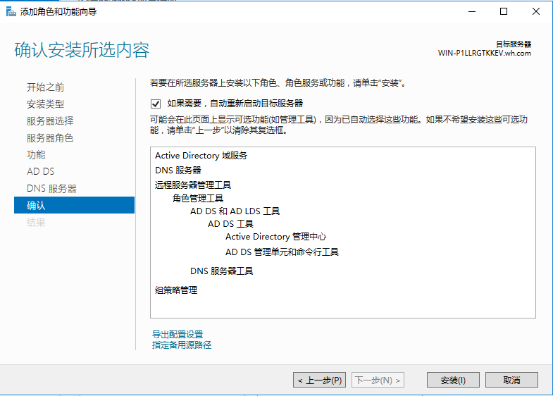 (7)进入确认页面,使用默认选项勾选“如果需要,自动重新启动目标服务器”完成之后点击安装开始证书服务的安装。