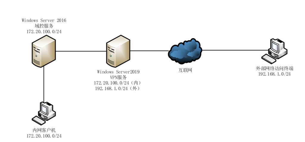 本次配置中,公司内部部署了域控服务,域控服务为Windows server2016,域控网段默认不允许访问外部网络,在企业的边界出口处部署了Windows server2019来作为vpn服务器,该服务器存在双网卡,一个网卡连接互联网,为外部的用户提供vpn网关,另一个网卡为公司的内部域控网络,用来实现内部网络的连接。所以在该内部网口需要启用地址转换nat功能来实现vpn隧道的内部访问,网络结构如下所示。