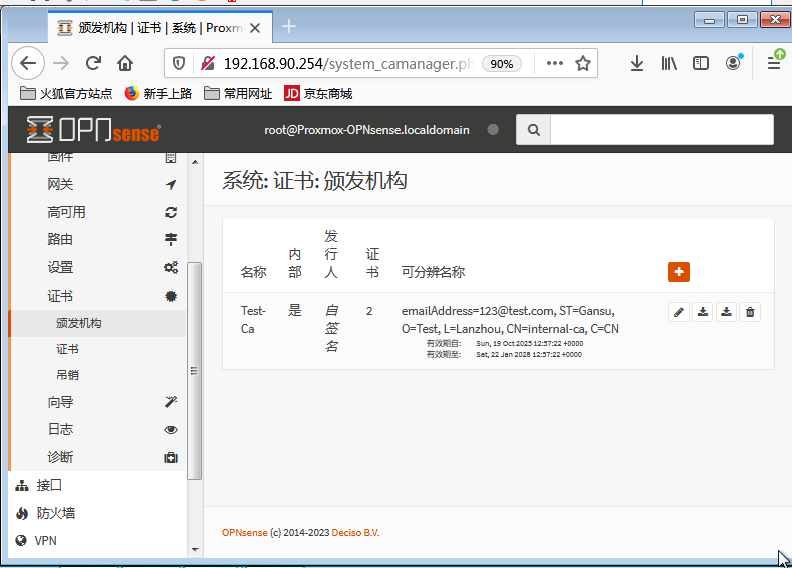 1.登录系统,选择设置一次点击证书,点击办法机构,创建一个内部的证书颁发机构,用于内部用户的用户证书功能。