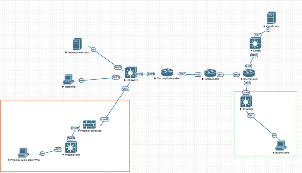 在家庭网络中,连接上层光猫的路由器为TP-Link路由器,连接所有的服务都运行在Proxomx中,所以我的OpnSense也部署在虚拟机中,我的拓扑图如下。